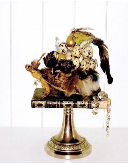 Collage et dorureLaiton, perles, oeufs de caille, tortue ancienne naturalisée, oiseau naturalisé, livre d’école XIXè et pampilles en cristalAnnée : 2017Dimension : 25 x 25 x 17 cm
