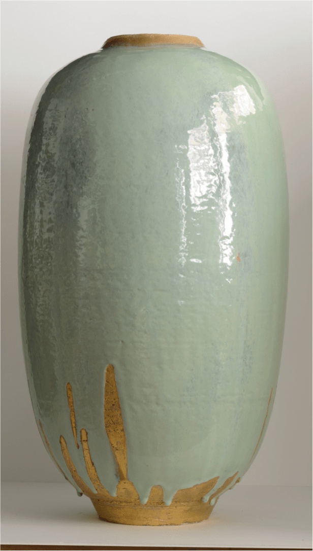 CELA MIDORI /4, 2020, par Karen SwamiGrès tourné, émaillé et retravaillé à la laquevégétale japonaise et à l'or pur.Pièce unique59 (H) x 35 (D) cm